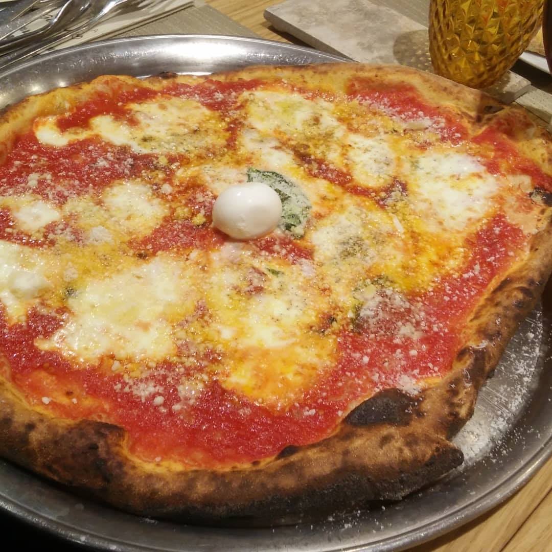 Ecco la bufalina maxi di Casa Marigliano. Dimensione extra, Margherita tradizionale servita su piatto in alluminio per tenerla calda a lungo. L’aggiunta di pecorino che fila è una novità assoluta che merita.