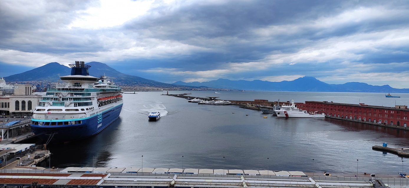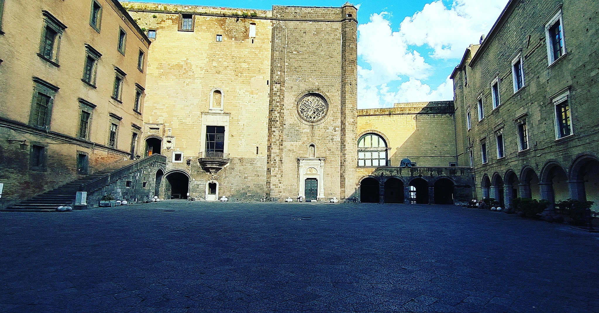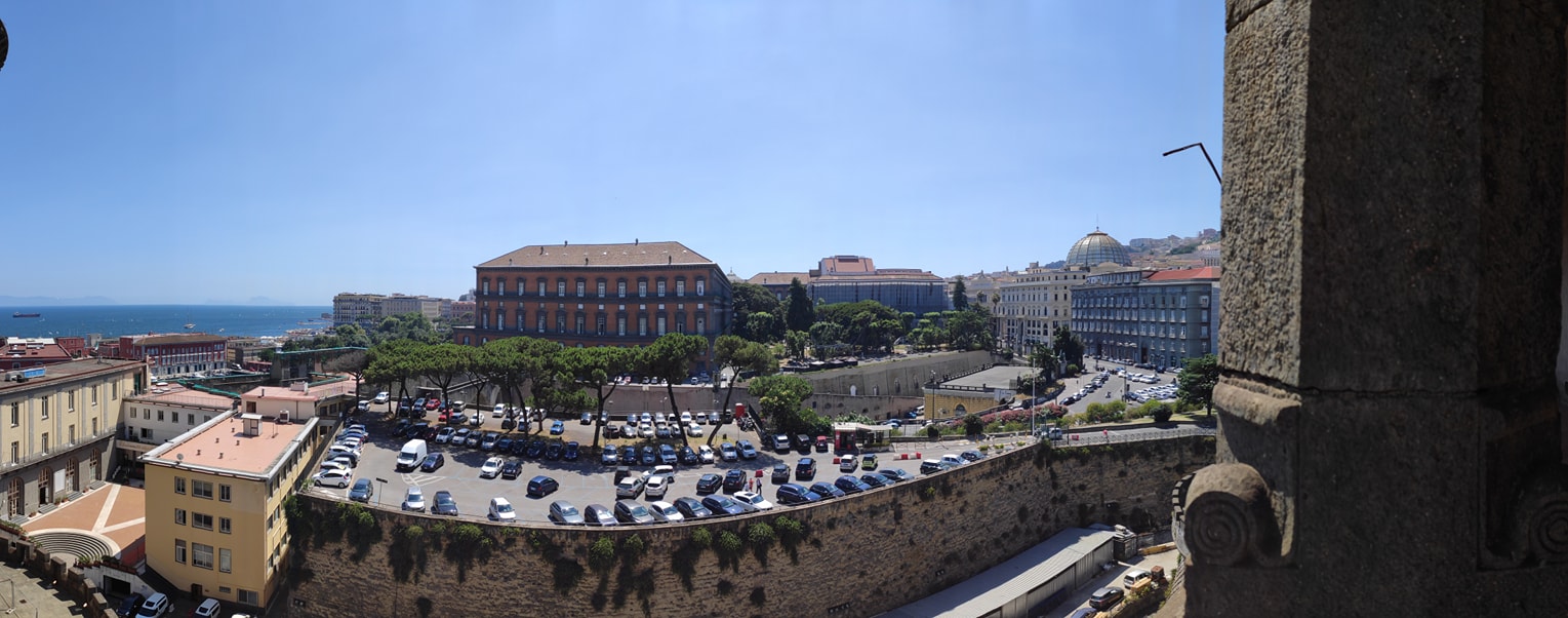 Insolita vista dal terzo piano del Castel Nuovo, sale dei musei. Nuovamente visitabile dal 2 Giugno dopo il periodo covid. Visitabili le piazza d’armi, la sala dei baroni e i tre piano del museo civico.
