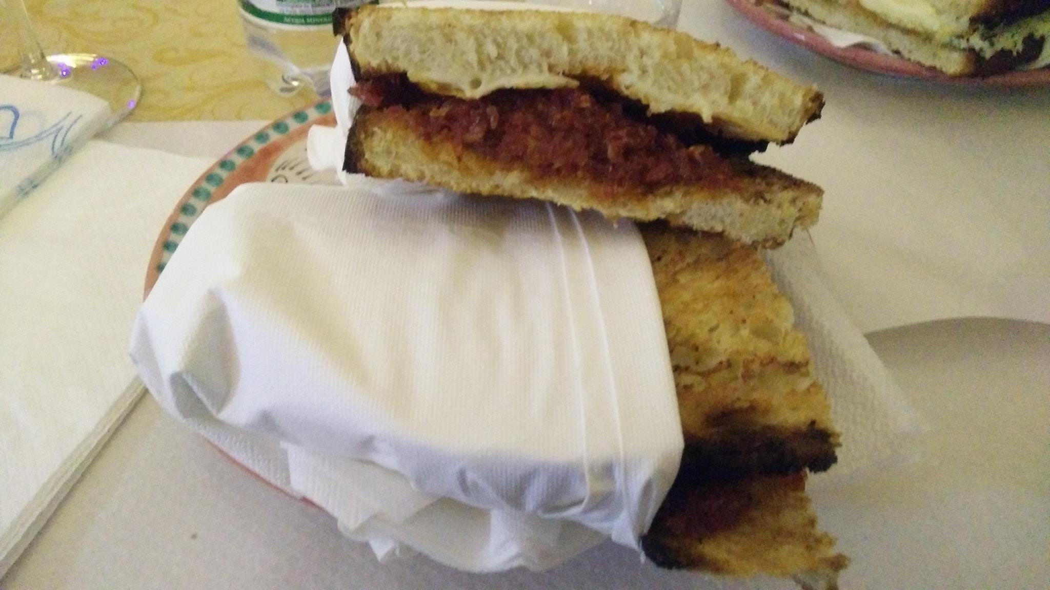Pane cotto a legna, salsiccia secca piccante calabrese e provola compone la “bestemmia”. Mentre la carciofotta: crema di carciofi, zucca arrostita e scamorza.