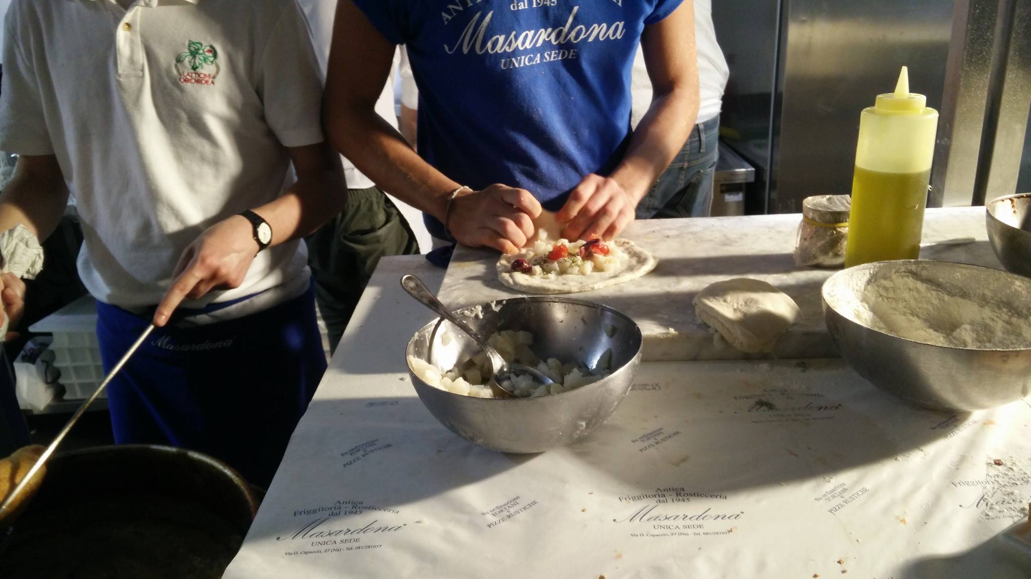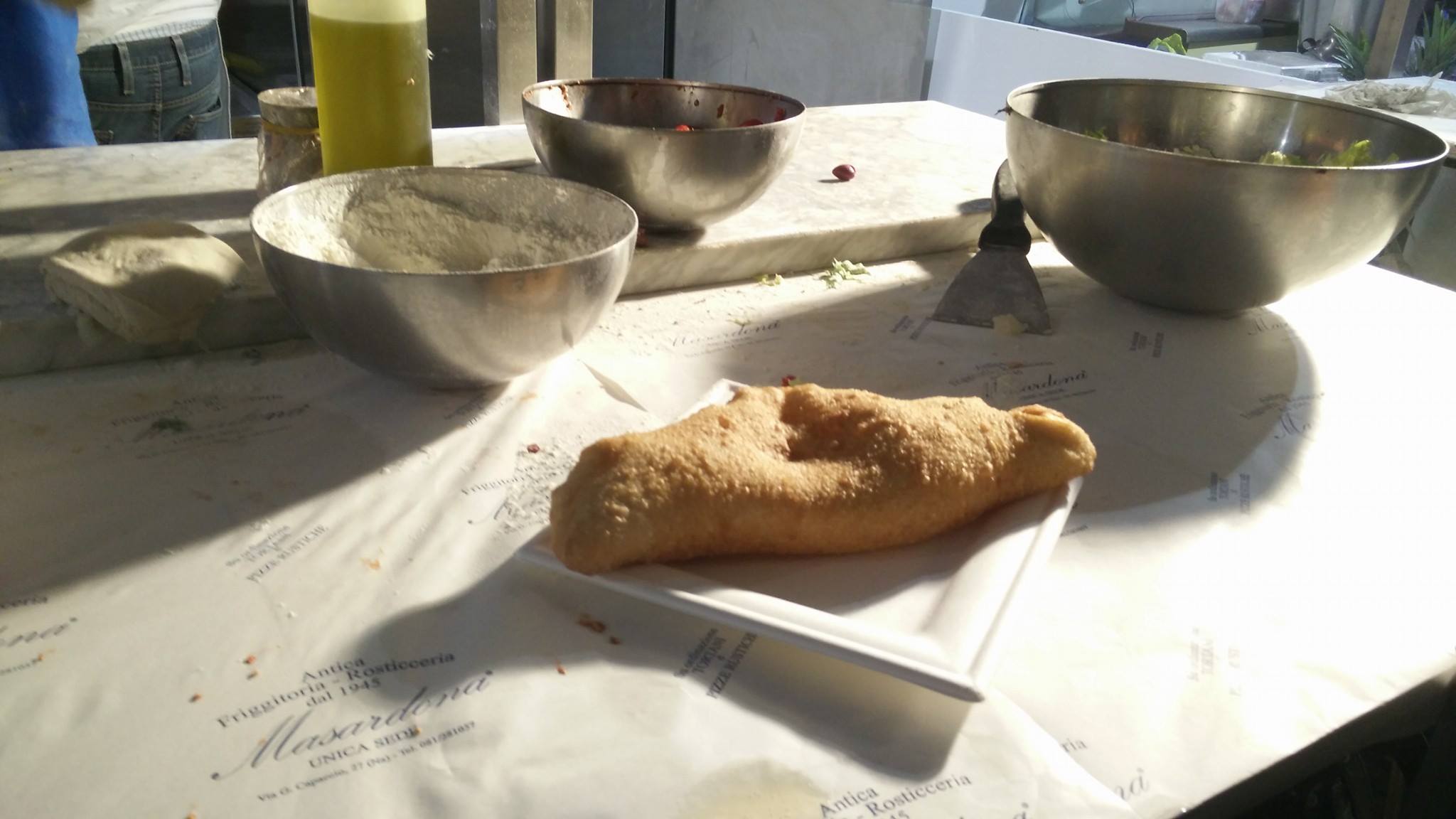 Per la precisione il battilocchio, versione più piccola della classica piazza fritta partenopea. Qui in versione baccalà, ulive nere e pomodori. Da provare a quella della Masardona (zona Loreto mare).