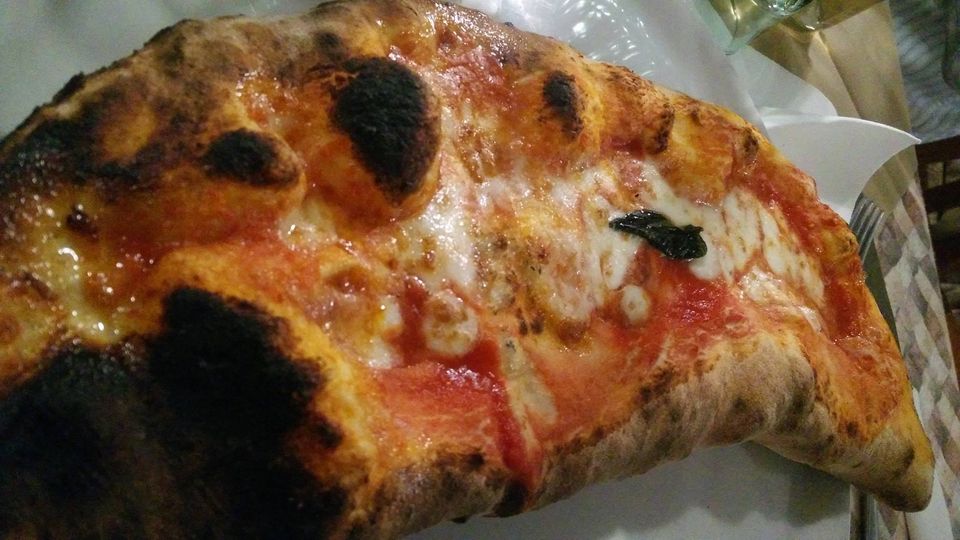 Pizza al forno ripiena di salame e ricotta con vista sui resti della chiesa di Carminiello ai Mennesi. Un buon vino bianco per accompagnare la pizza