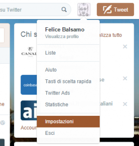 - Nel mio caso clicco tra l’icona “cerca” e Tweet. Cliccando compare un menù, tra le varie voci selezionare Impostazioni