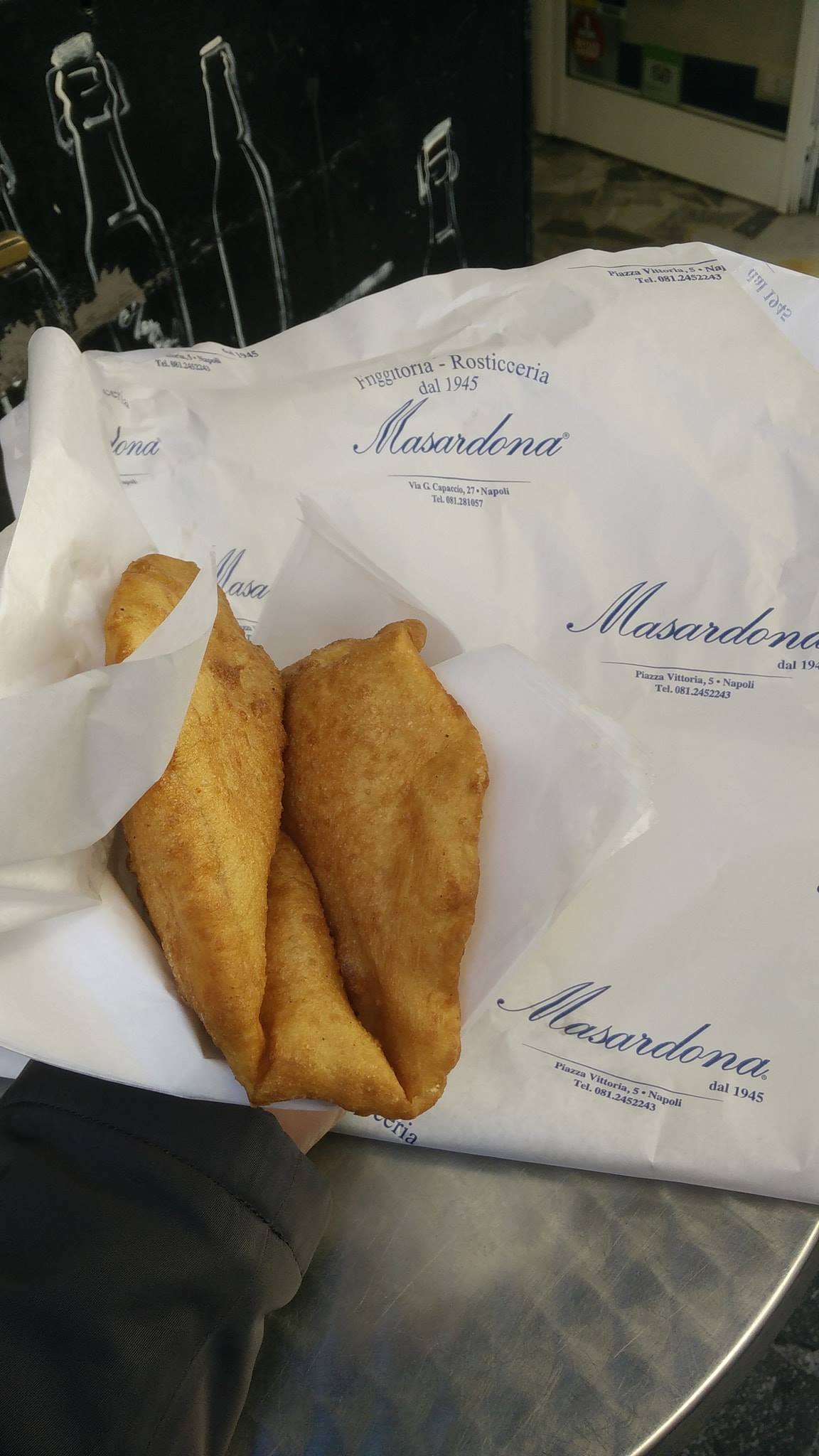 Veloce pizza fritta “completa” che nel gergo partenopeo vuol dire: cicoli, ricotta, pepe e pomodoro. Ora nella versione senza pomodoro per me troppo